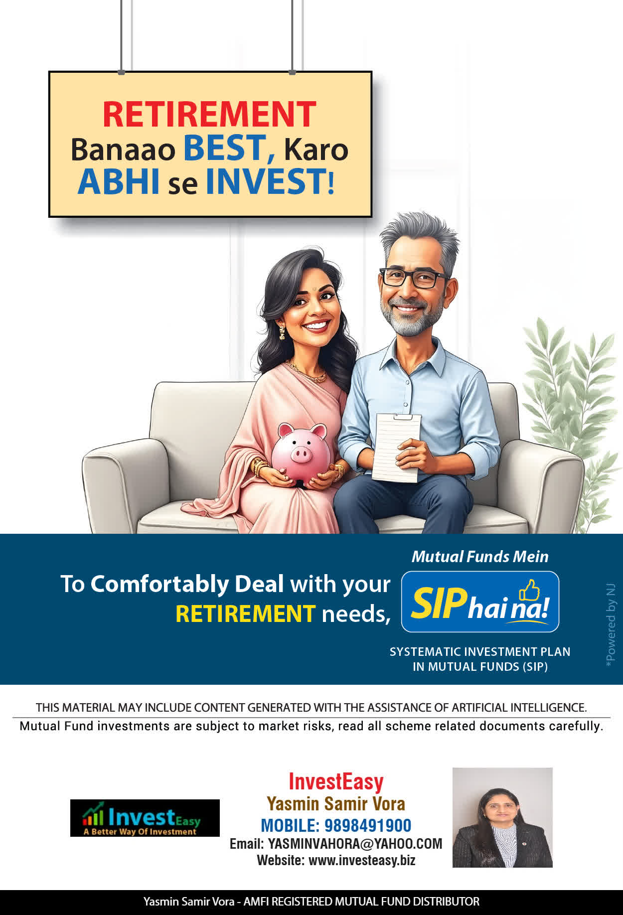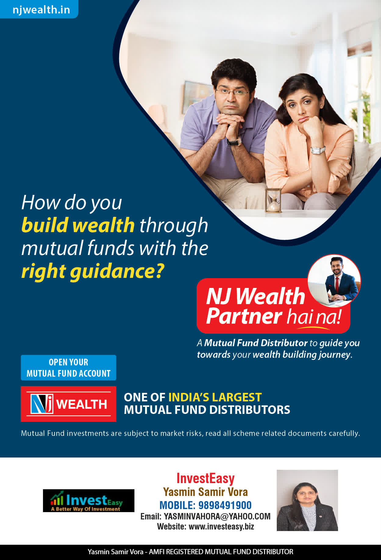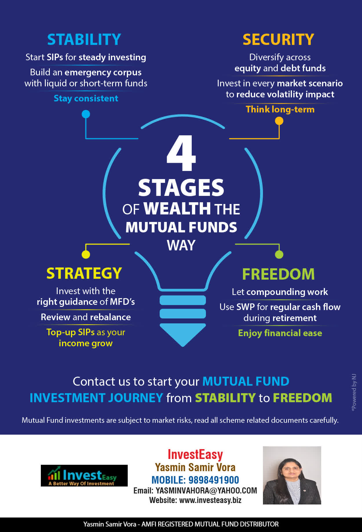 At, Invest Easy(Yasmin Vora) our mission is to provide our clients with the best solutions in wealth creation and wealth management. We are driven to provide clients with simple, unbiased and uncluttered professional advice that adds value to their quality of life and results in actionable solutions.