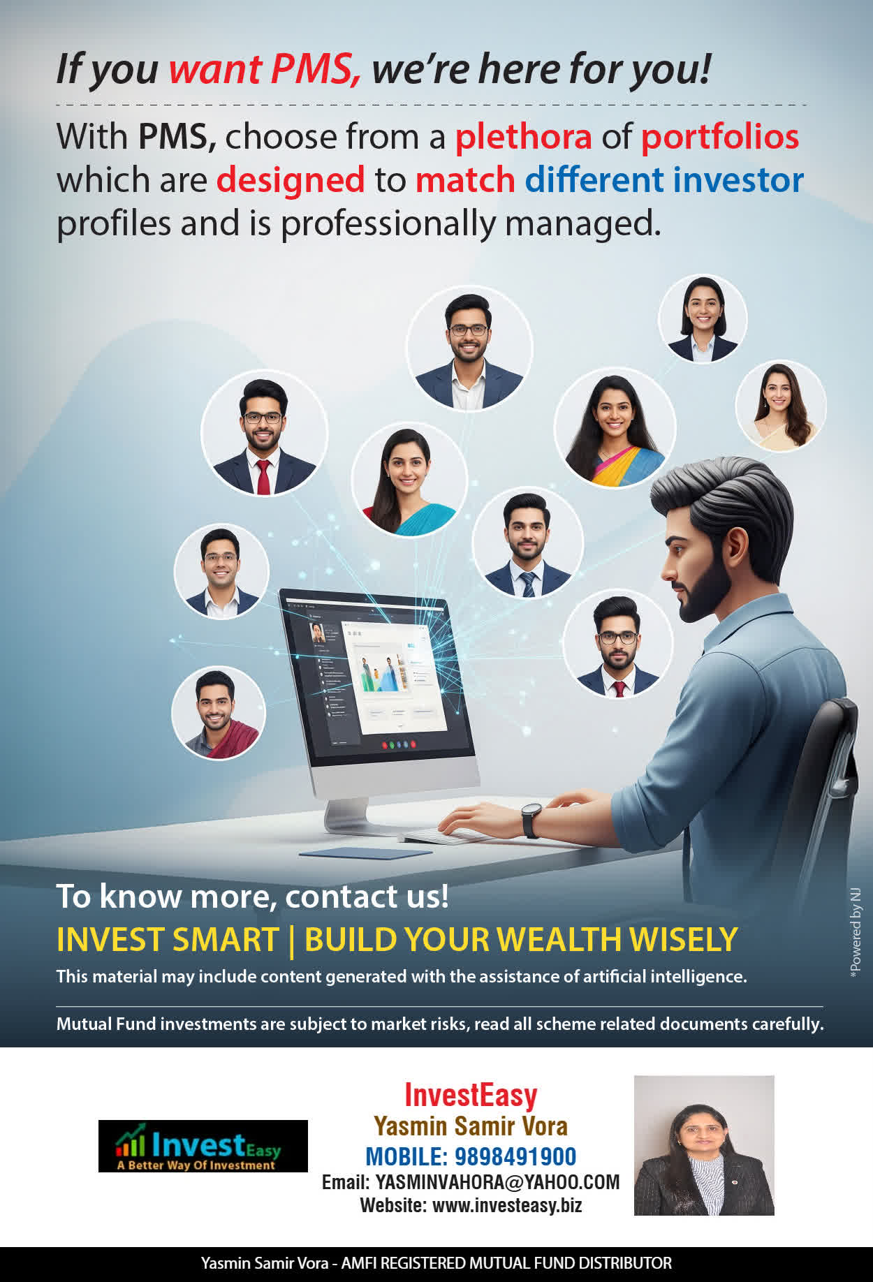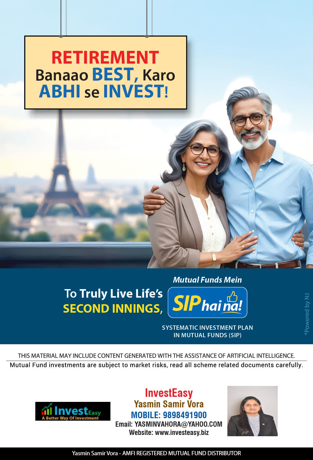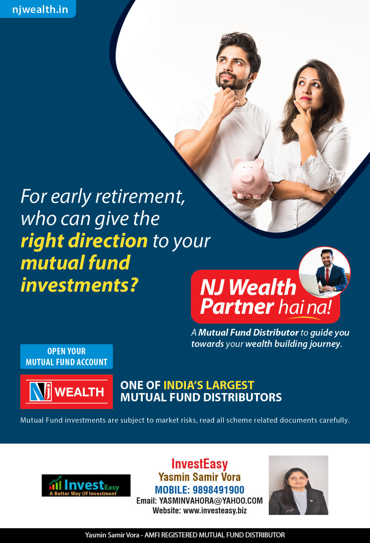 At, Invest Easy(Yasmin Vora) our mission is to provide our clients with the best solutions in wealth creation and wealth management. We are driven to provide clients with simple, unbiased and uncluttered professional advice that adds value to their quality of life and results in actionable solutions.
