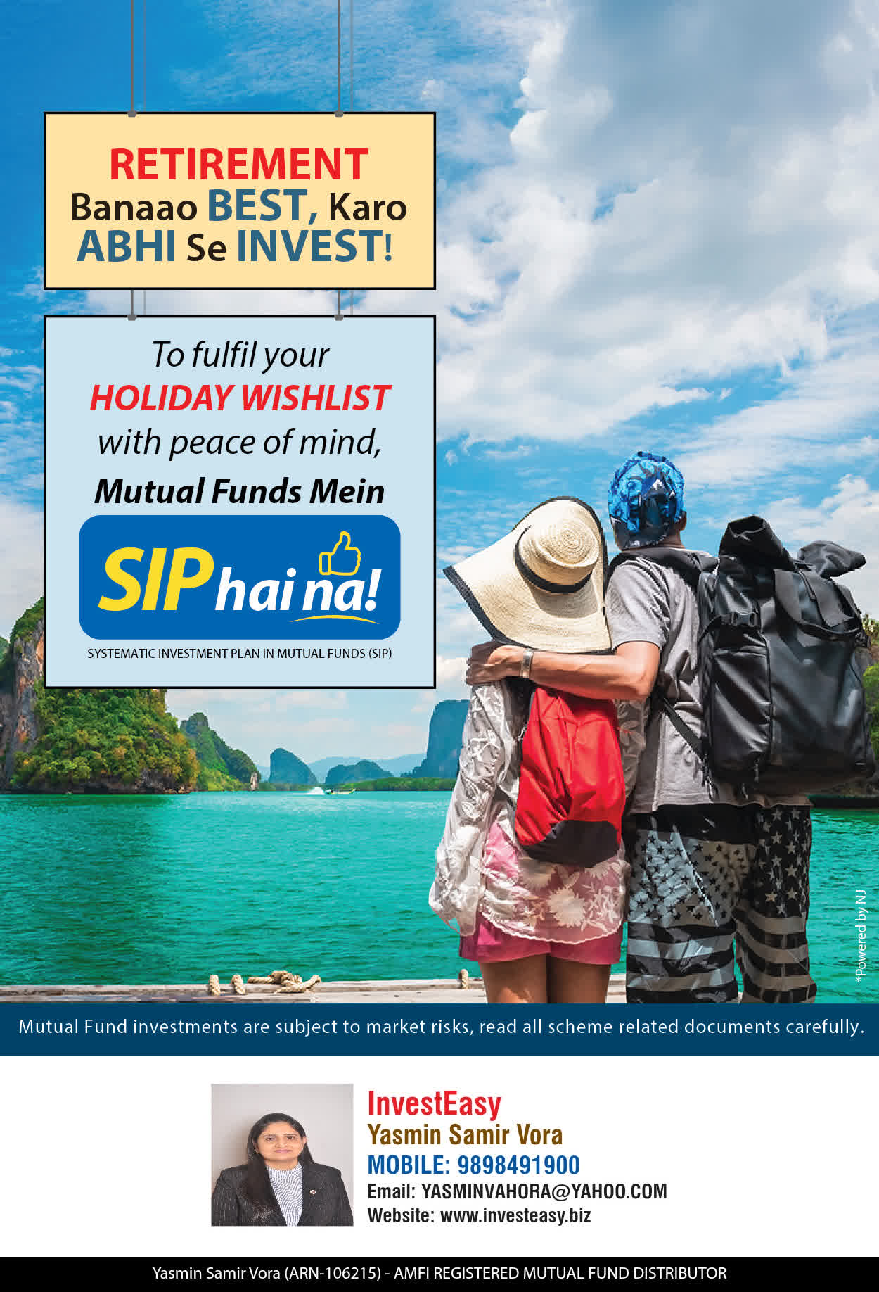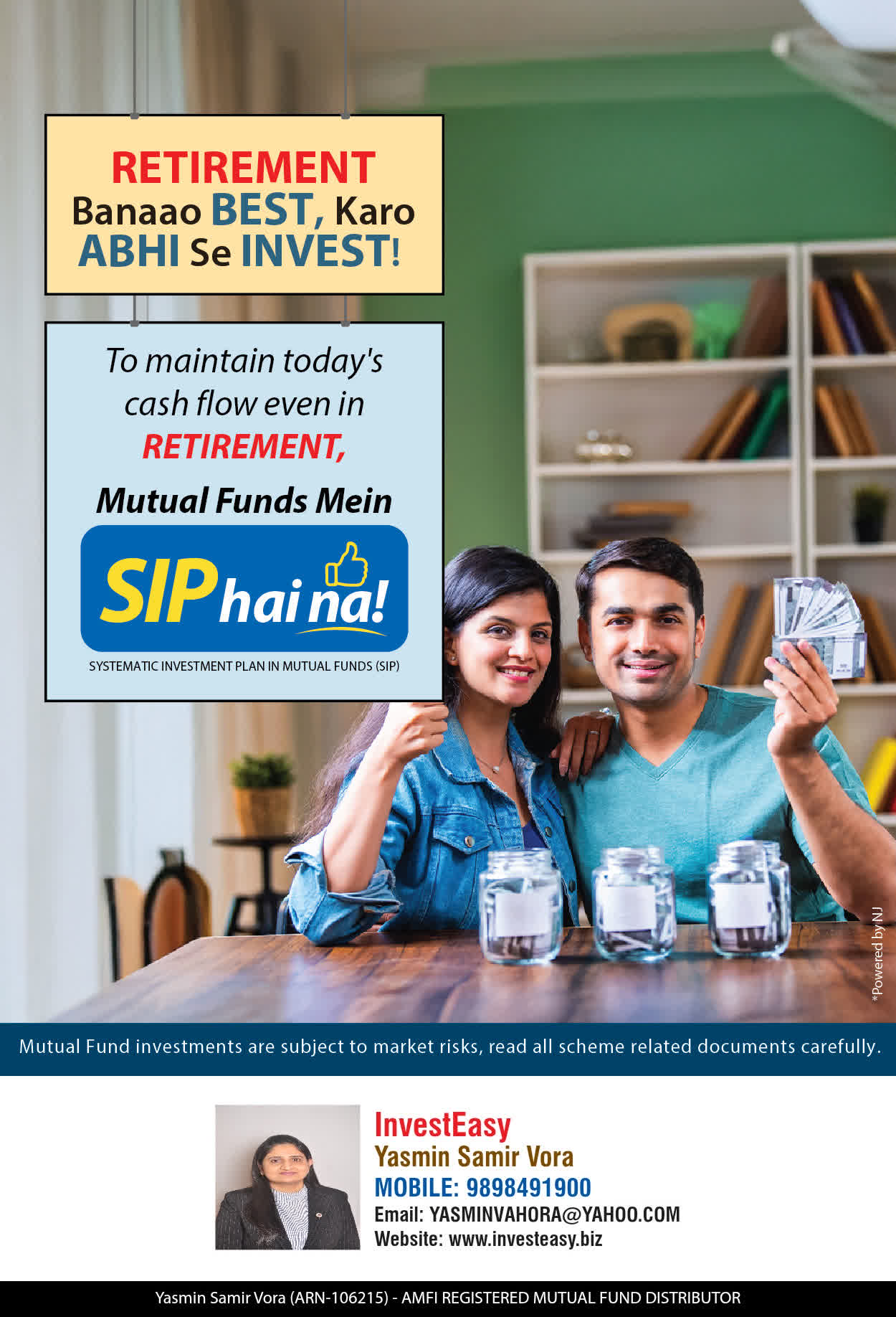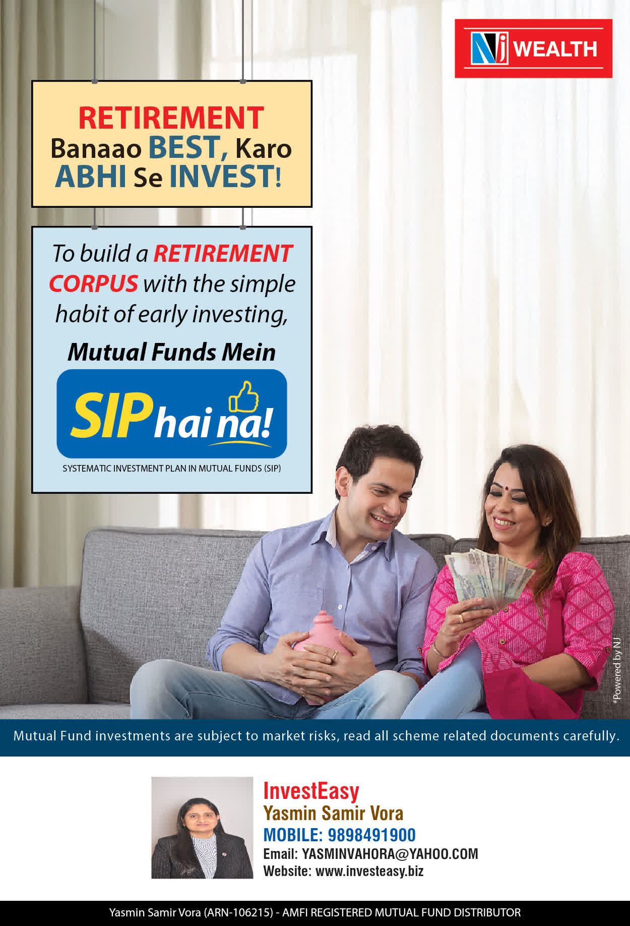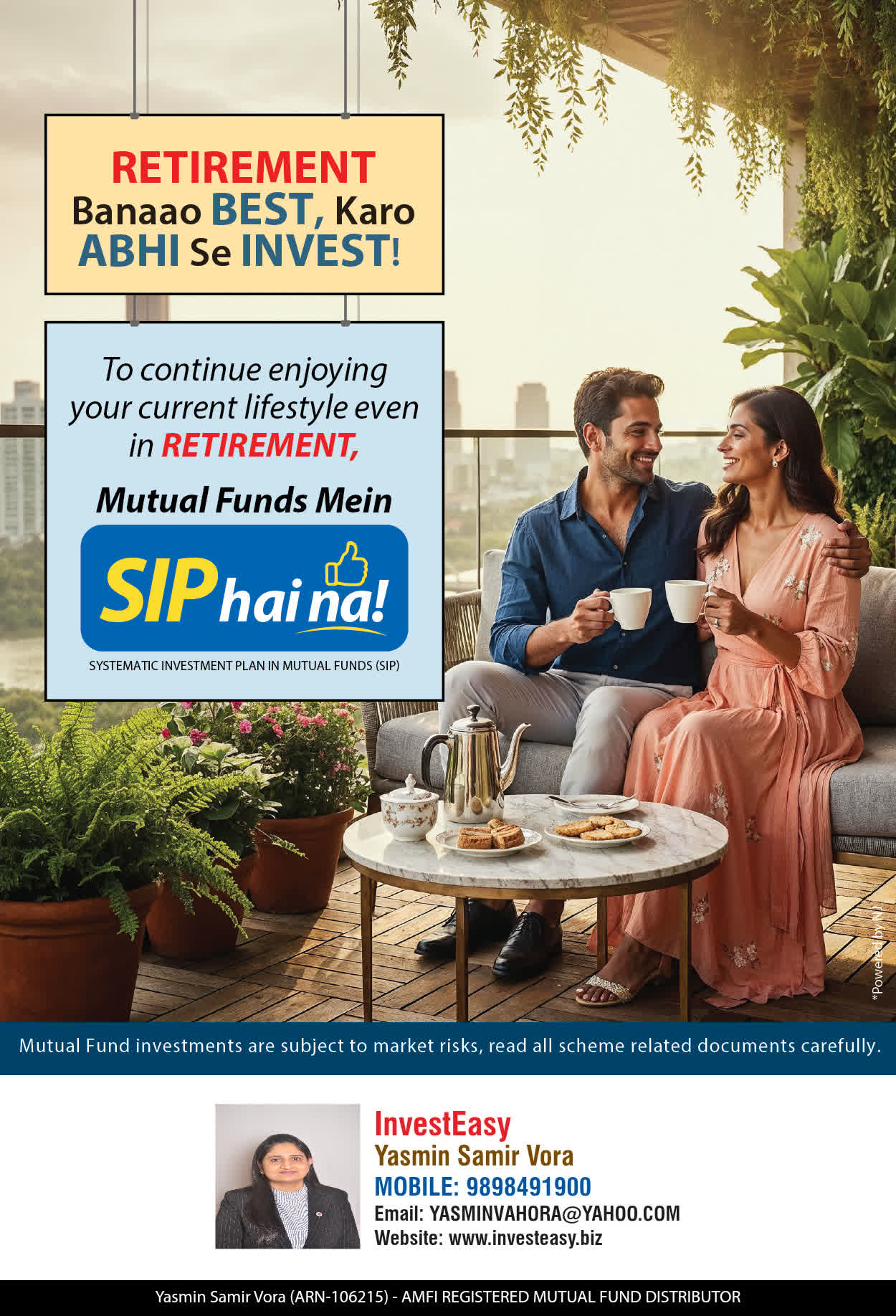 At, Invest Easy(Yasmin Vora) our mission is to provide our clients with the best solutions in wealth creation and wealth management. We are driven to provide clients with simple, unbiased and uncluttered professional advice that adds value to their quality of life and results in actionable solutions.